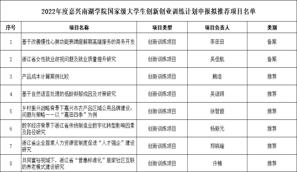 根据教育部《国家级大学生创新创业训练计划管理办法》(教高函〔2019〕13号)和《十大买球官方网站大学生创新创业训练计划项目管理办法》(嘉南院教字〔2021〕19号)的有关规定,经项目团队申报,学院组织专家评审,拟推荐以下8个项目申报十大买球官方网站国家级大学生创新创业训练计划项目。