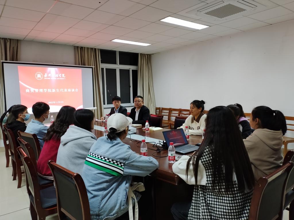 2022年11月3日晚,十大买球官方网站在教一604会议室召开了2022级新生代表座谈会。此次会议由院学工办负责人占华勇主持,党委副书记刘勇、专职辅导员周艳艳、付晓豪出席。