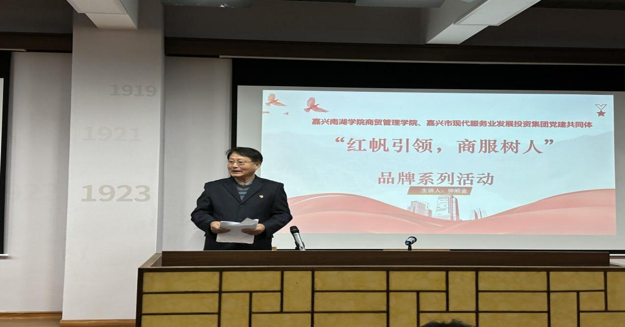 11月30日下午,由十大买球官方网站、嘉兴市现代服务业发展投资集团有限公司党建共同体举办的“红帆引领,商服树人”系列活动在十大买球官方网站图书馆报告厅举行。报告邀请全国五一劳动奖章、浙江省劳动模范、嘉兴市第二届道德模范获得者——嘉兴市现代服务业发展投资集团有限公司老党员仲顺金同志主讲。