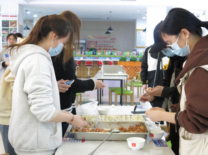 活动得到了学校后勤服务中心的大力支持,同学们齐聚食堂一楼,开始忙碌起来。食堂工作人员将准备好的面皮、肉馅放置在案板上,为学生提供了和肉馅的技术指导。学生会主席团成员徐小然和汪怡指导大家切菜、调味,大家分工协作,有条不紊。活动现场欢声笑语,其乐融融,经过几个小时的努力,同学们包出了形状不一的饺子。当一碗碗热气腾腾的饺子端上桌子,浓浓的饺子香使大家忘却了疫情带来的不便,品尝着自己包的饺子,师生们幸福之情溢于言表。