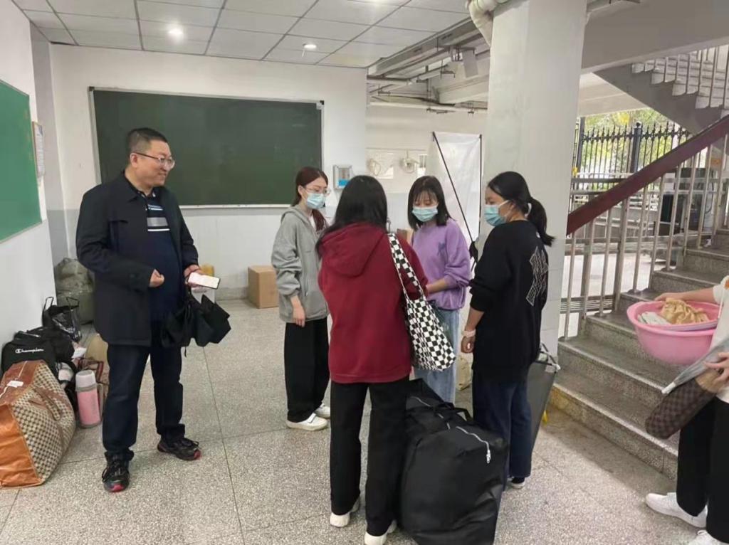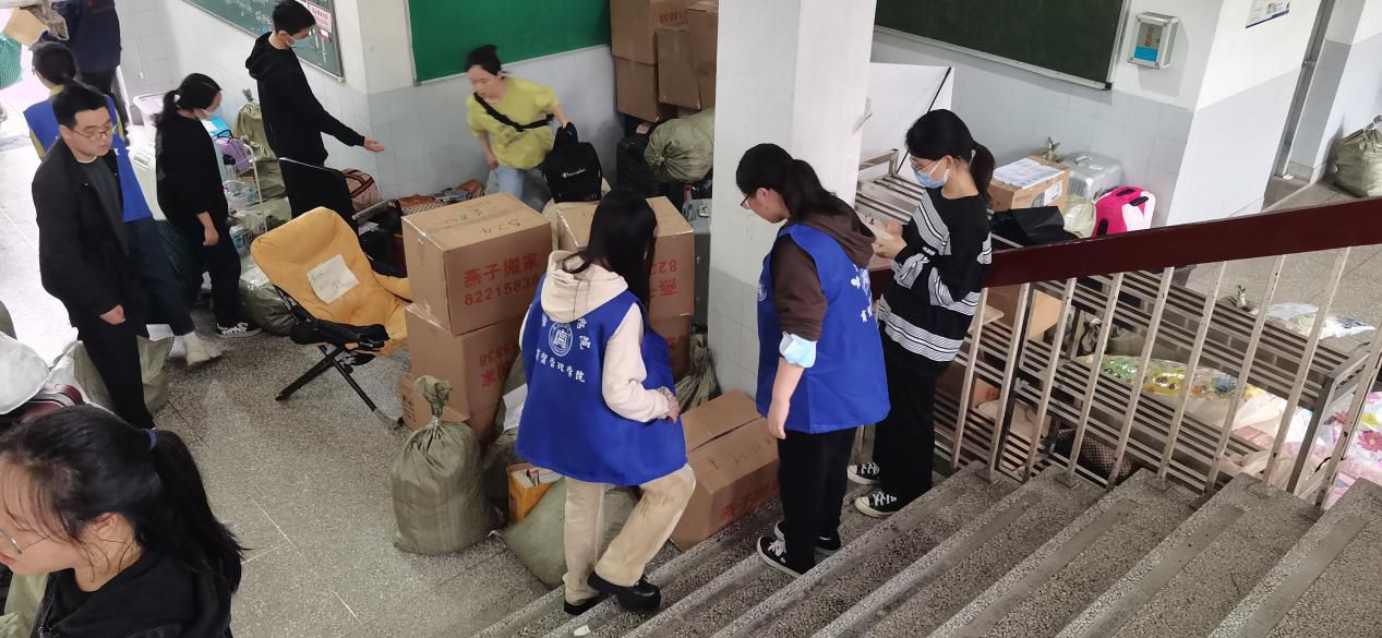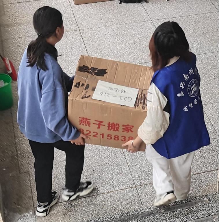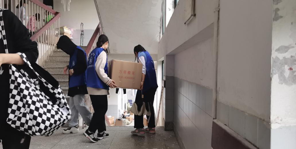 志愿者们身穿统一的蓝色马甲,帮助学姐们搬着行李和杂物。这次搬迁,大四的住宿条件有了极大的改善,为大四学子的备考也注入了动力,彰显学校整体办学实力的日益提升。虽然箱子很重,楼梯难爬,但是志愿者们都非常地踊跃,丝毫没有懈怠,积极地整理寝室、打包物品、清理垃圾,在楼层间来回往返。他们在流汗,在喘气,在擦拭从额角滑落的一滴滴汗水,但是他们没有一句怨言,忙碌中看到的是他们疲惫但却带着笑容的脸庞。活动过程中,刘勇老师多次走访和慰问指导,展现了师生同心互助、校院团结一心的良好精神面貌,学姐们也在活动结束后表达了诚挚的谢意。